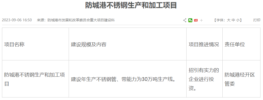 廣西防城港不銹鋼生產(chǎn)和加工項目主要建設年生產(chǎn)不銹鋼管、帶能力為30萬(wàn)噸生產(chǎn)線(xiàn),目前項目處于招引有實(shí)力的企業(yè)進(jìn)行投資階段。