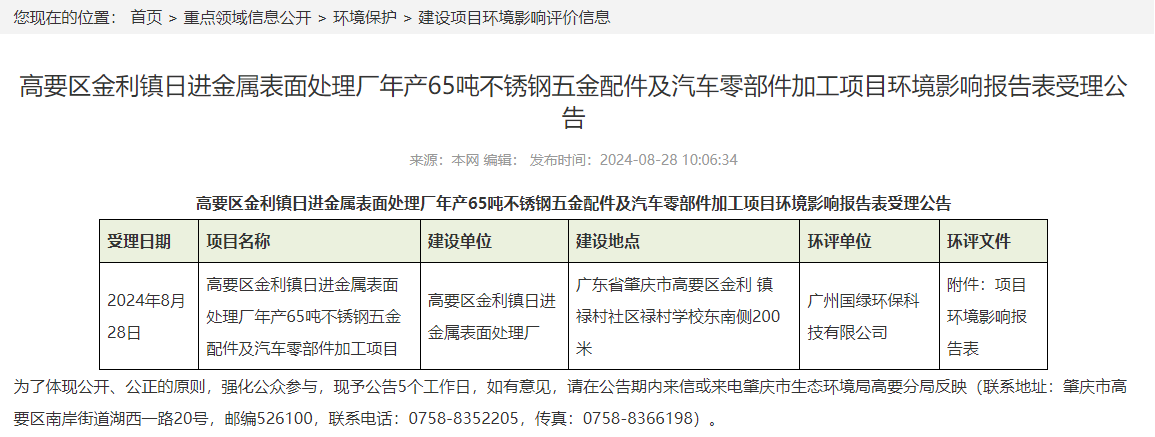 8月28日,肇慶市高要區金利鎮日進(jìn)金屬表面處理廠(chǎng)年產(chǎn)65噸不銹鋼五金配件及汽車(chē)零部件加工項目環(huán)境影響報告表獲受理公告,公告期:5個(gè)工作日。